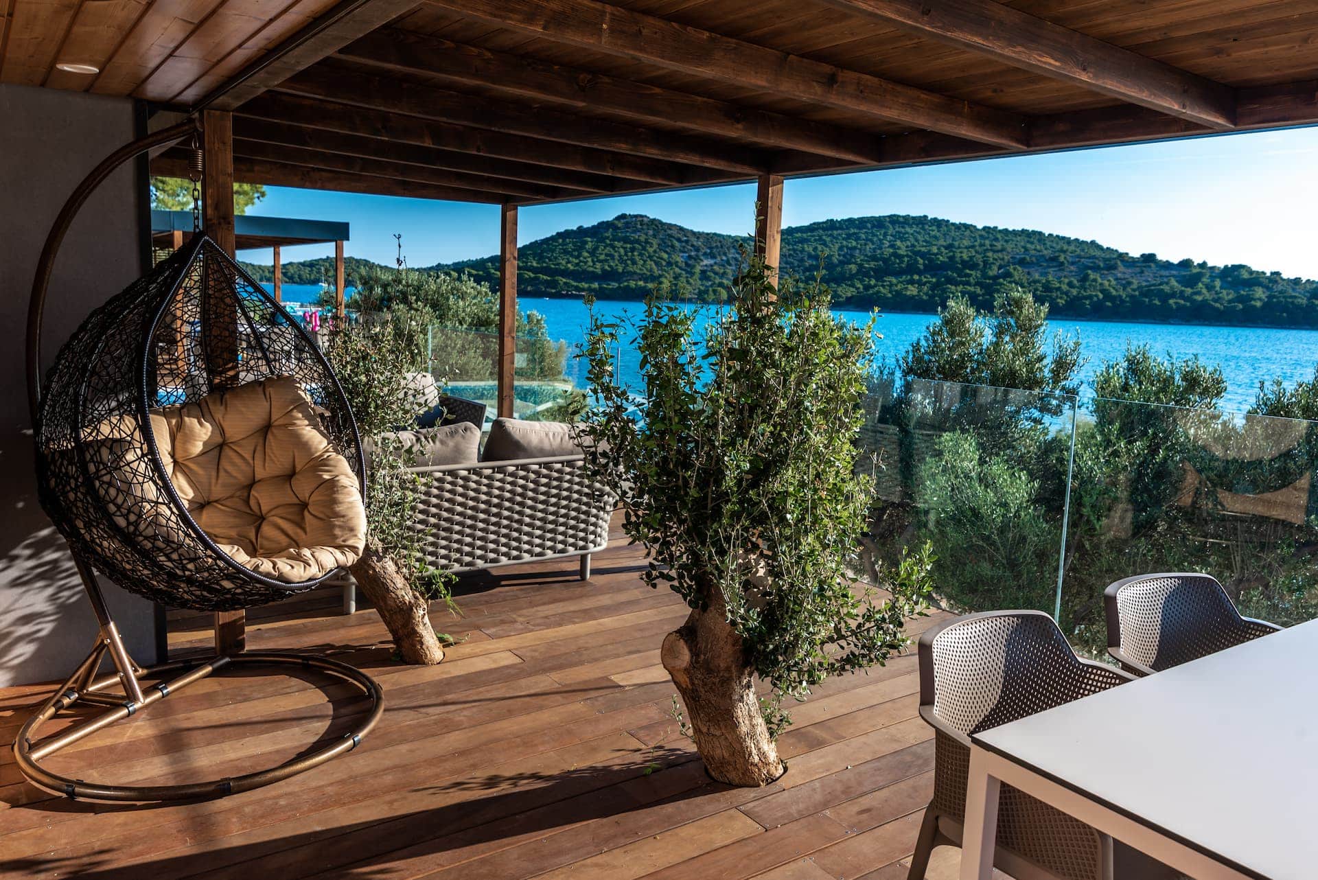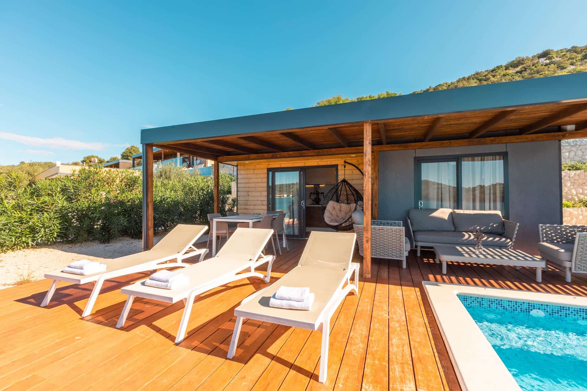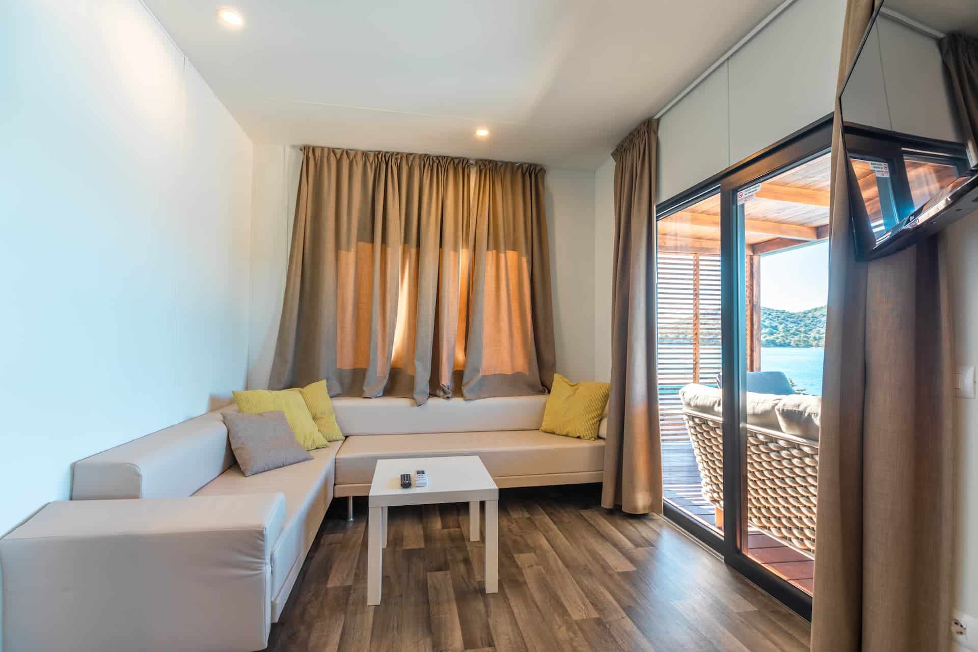 Much like our 2 bedroom Family Camping villa, offering more space but the same level of charm. Perfect for families of 4-5, the villa has 2 bedrooms, 1 bathroom, a spacious living room with corner sofa, self-contained kitchenette with dining table and a large sea-view terrace for sunset drinks, family hangs and morning coffees with a direct access to your swimming pool. The terrace is fully equipped with outdoor lounge furniture, patio chairs, table and sun loungers.