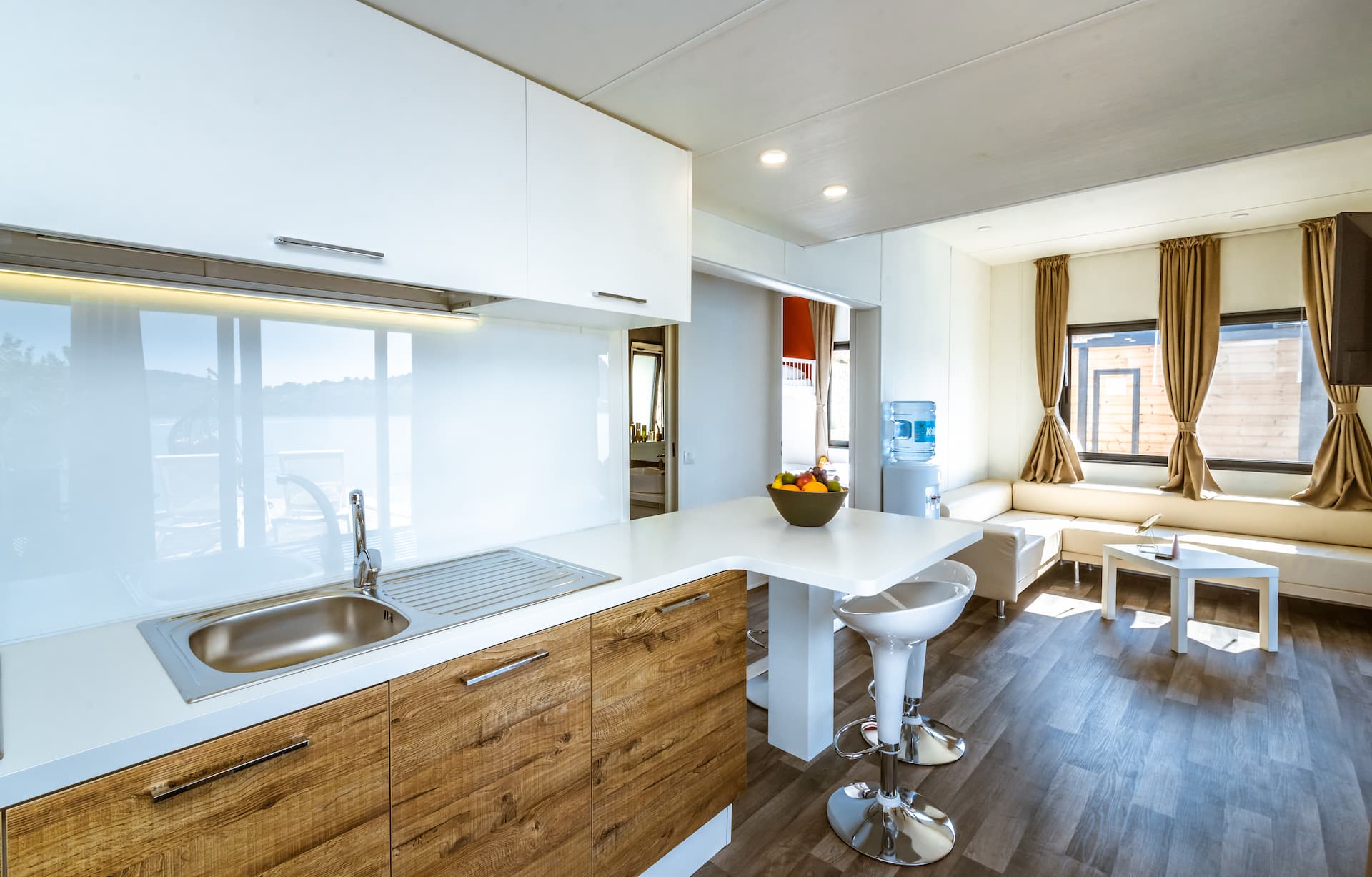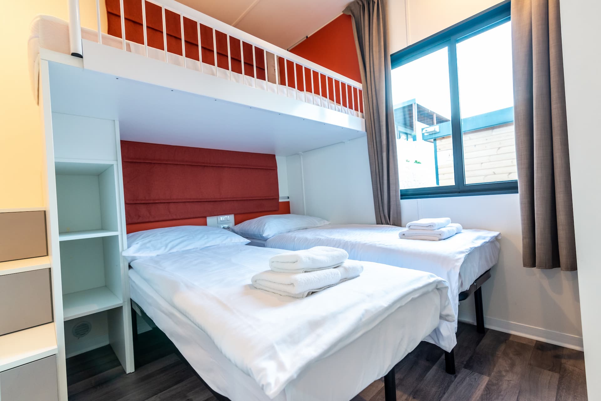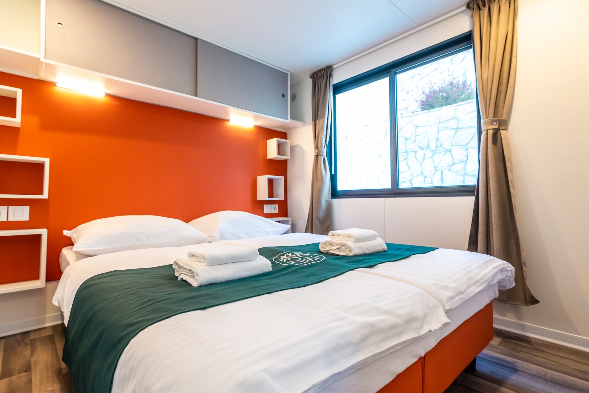 Much like our 2 bedroom Family Camping villa, offering more space but the same level of charm. Perfect for families of 4-5, the villa has 2 bedrooms, 1 bathroom, a spacious living room with corner sofa, self-contained kitchenette with dining table and a large sea-view terrace for sunset drinks, family hangs and morning coffees with a direct access to your swimming pool. The terrace is fully equipped with outdoor lounge furniture, patio chairs, table and sun loungers.